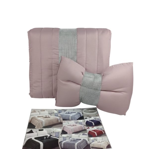 Trapuntino Copriletto Matrimoniale Charro Prestige con balza strass effetto Swarovski® e 2 cuscini a fiocco coordinati. Design elegante e moderno, trapuntatura lineare e tessuto 100% poliestere morbido e resistente.