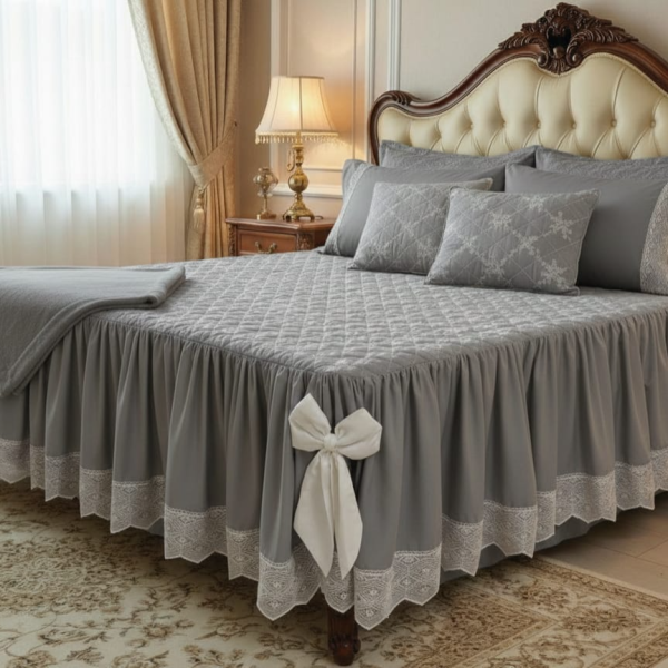 Il Trapuntino Matrimoniale Versailles (260×270 cm) con 2 cuscini coordinati unisce romanticismo e raffinatezza: ricami delicati, rouche, pizzo e fiocchi decorativi per una camera dal fascino senza tempo. Realizzato artigianalmente in Italia, è disponibile nei colori Salvia, Cipria, Panna, Tortora e Grigio.