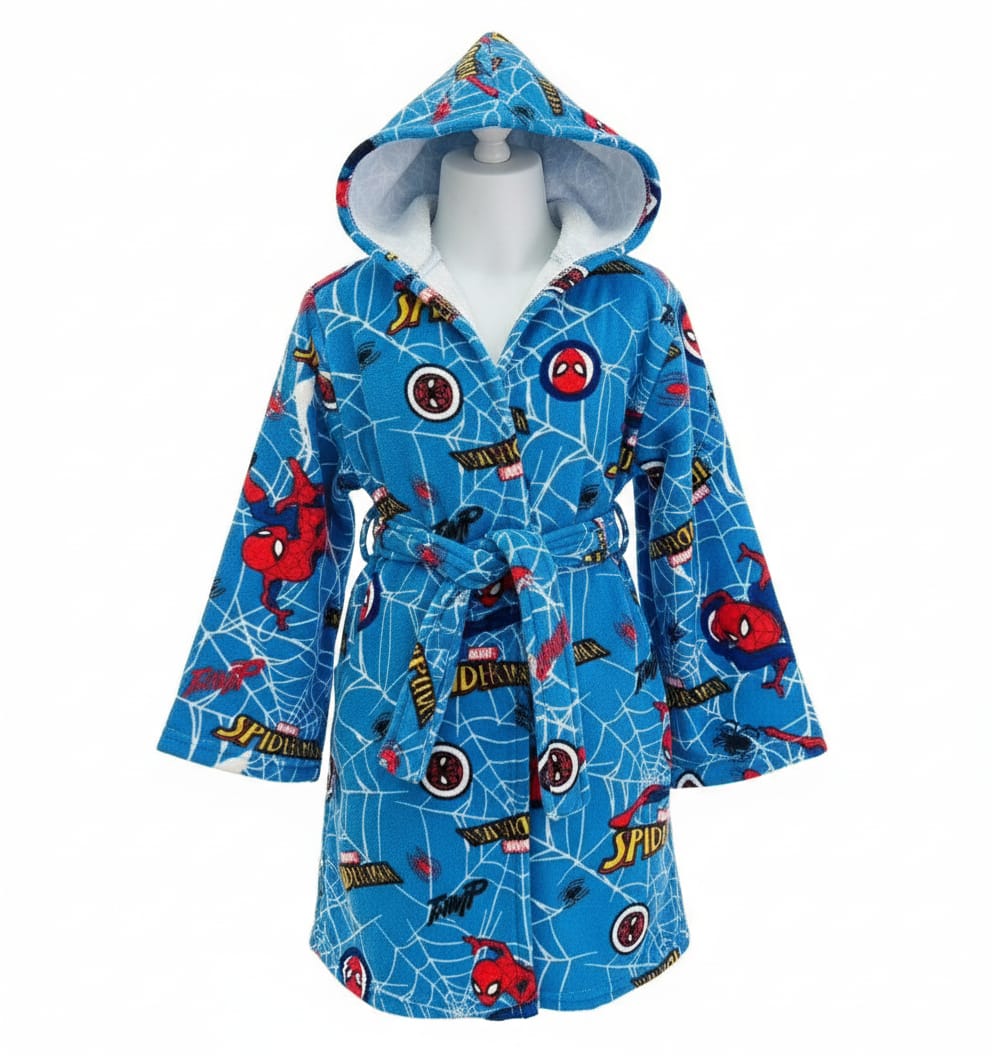 Dotato di cappuccio avvolgente, maniche lunghe e cintura in vita, garantisce una vestibilità pratica e confortevole. Il design è impreziosito da una vivace fantasia con Spider-man su fondo azzurro, perfetta per rendere il momento del bagno ancora più divertente.