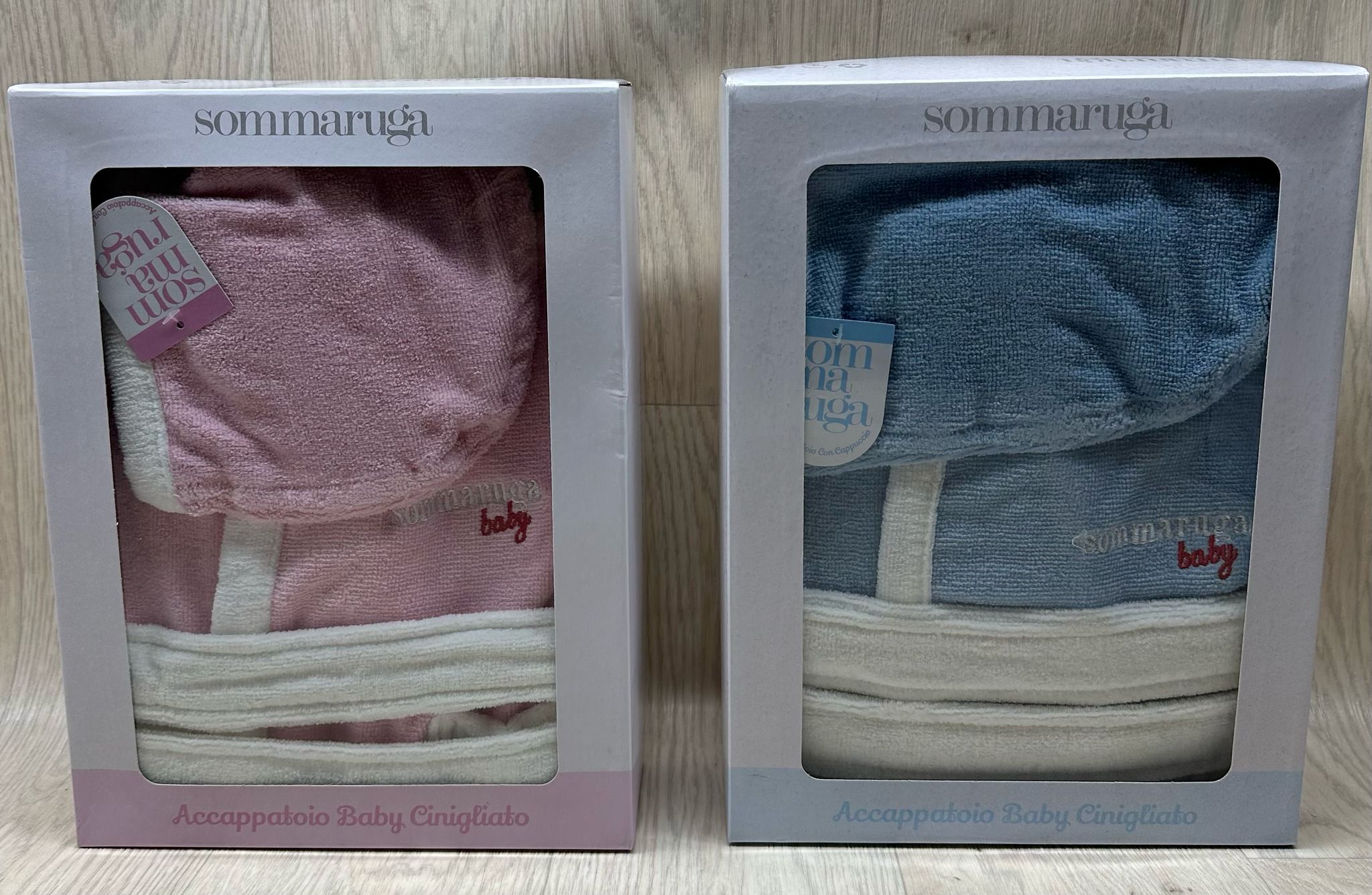 Accappatoio misura baby con cappuccio in spugna cinigliato, modello tinta unita con tasche e con logo Sommaruga Baby ricamato a rilievo.