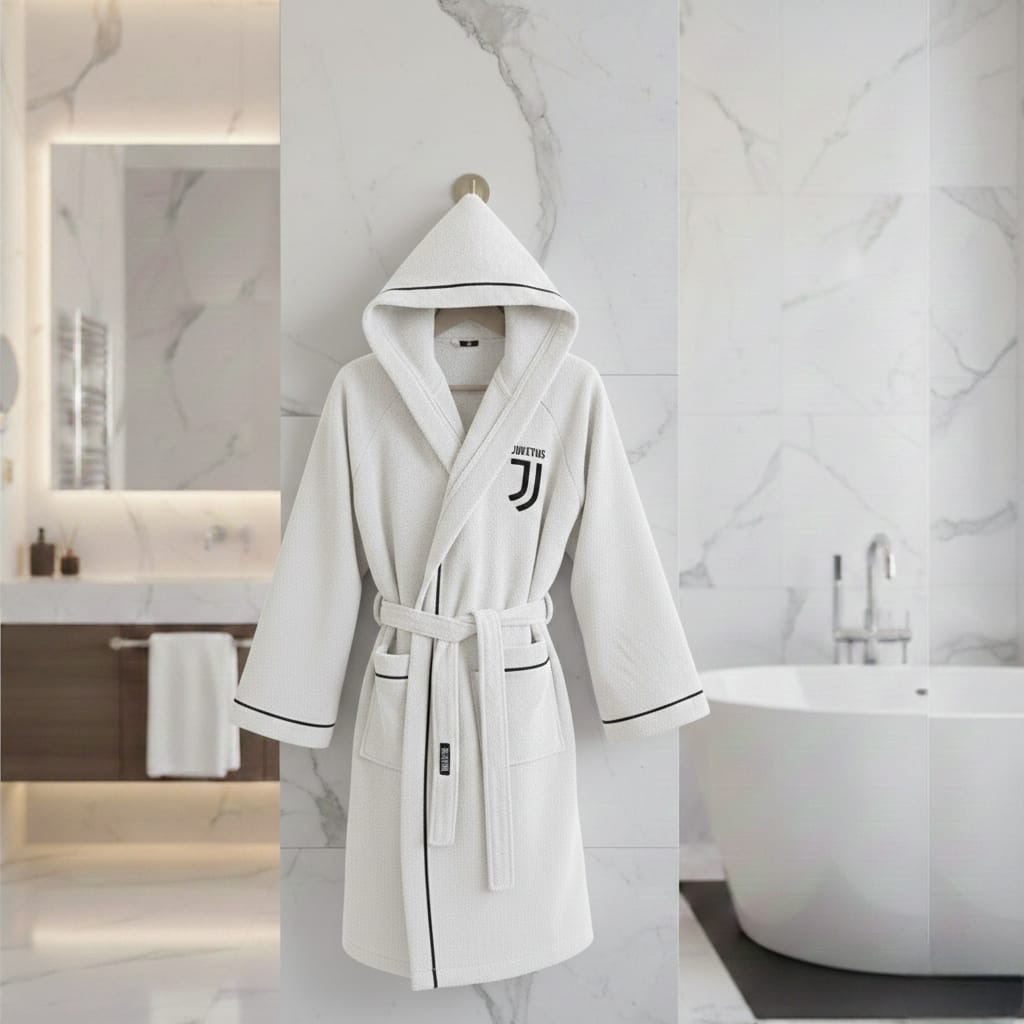 Seguire la propria squadra del cuore non è solo un passatempo oppure un hobby del tempo libero, per tanti si tratta di una vera e propria passione. L\’accappatoio ufficiale della squadra F.C. Juventus è un prodotto originale solo per veri tifosi. Realizzato in morbida microspugna a riccio, cattura le molecole d\’acqua fino al completo assorbimento e occupa poco spazio.