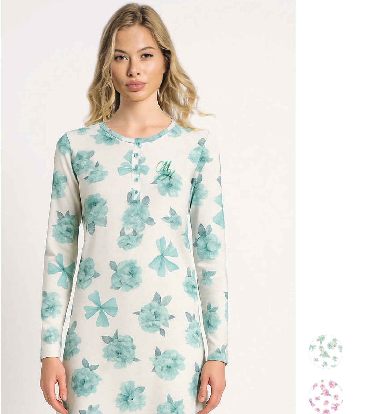 Il modello serafino con bottoni sul davanti unisce praticità e stile, rendendola ideale anche per chi cerca comodità senza rinunciare a un tocco femminile. La delicata fantasia floreale con fiocchi aggiunge un’eleganza romantica e raffinata.