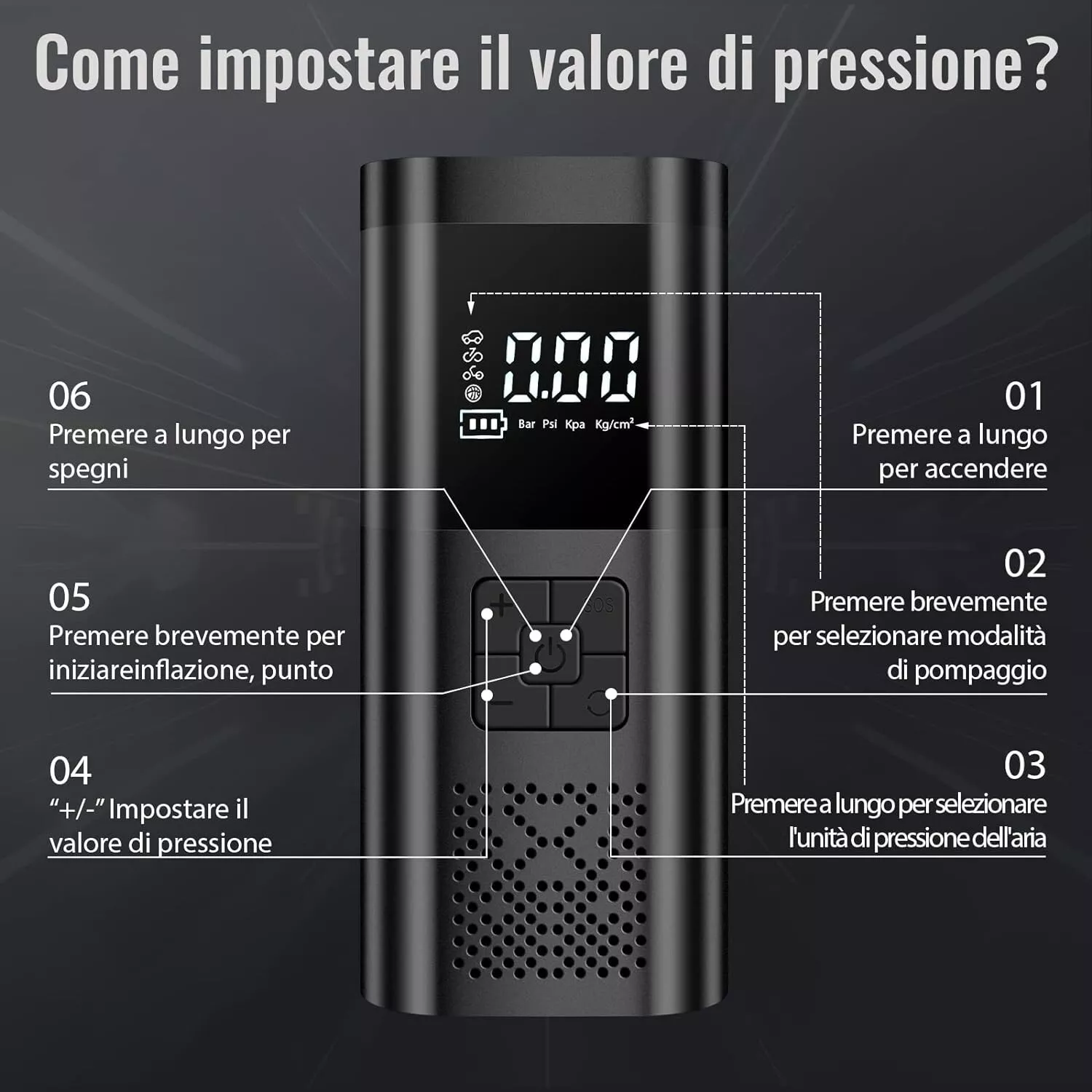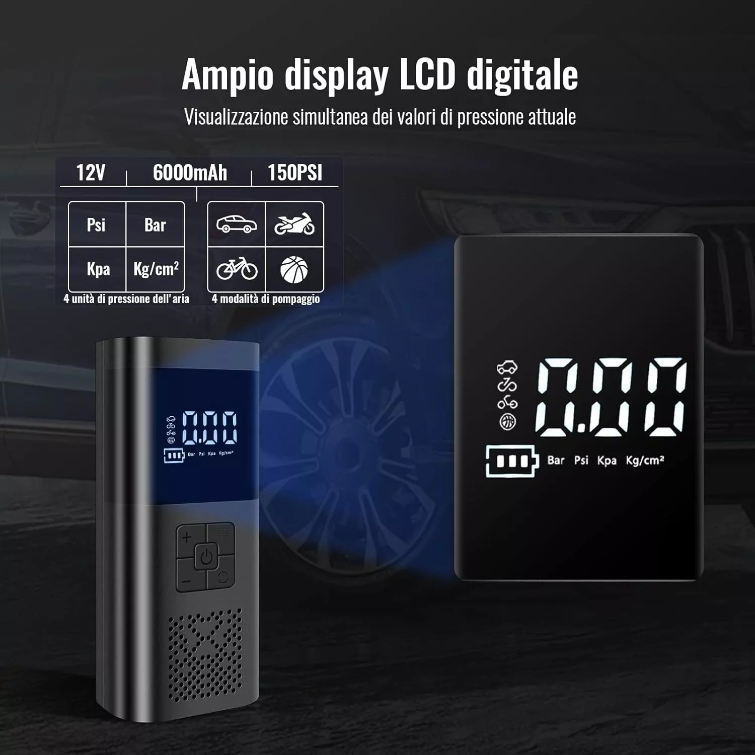 • Display LCD a Cristalli Liquidi e Luce di Emergenza a LED: Il compressore a batteria è dotato di display digitale LCD con valore della pressione del manometro e livello della batteria; 4 modalità di pompaggio: modalità pneumatici per auto, modalità moto, modalità bicicletta, modalità palla; 4 diverse unità di pressione: Psi , Kpa, Bar, Kg/cm². Inoltre, la pompa dispone anche di tre modalità di illuminazione di emergenza: illuminazione a LED, SOS e spie di avvertimento.