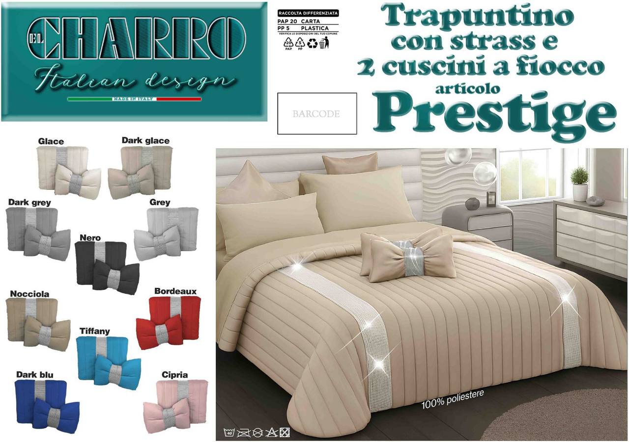 Rendi la tua camera da letto moderna e raffinata con il Trapuntino Copriletto Charro Prestige, un modello elegante impreziosito da luminosa balza con strass effetto Swarovski e 2 cuscini coordinati con fiocco decorativo.