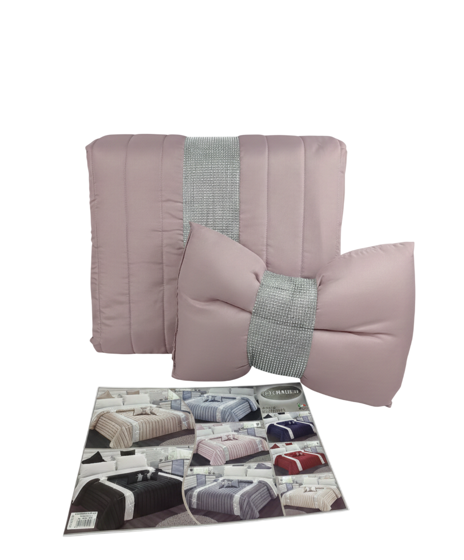 Trapuntino Copriletto Matrimoniale Charro Prestige con balza strass effetto Swarovski® e 2 cuscini a fiocco coordinati. Design elegante e moderno, trapuntatura lineare e tessuto 100% poliestere morbido e resistente.