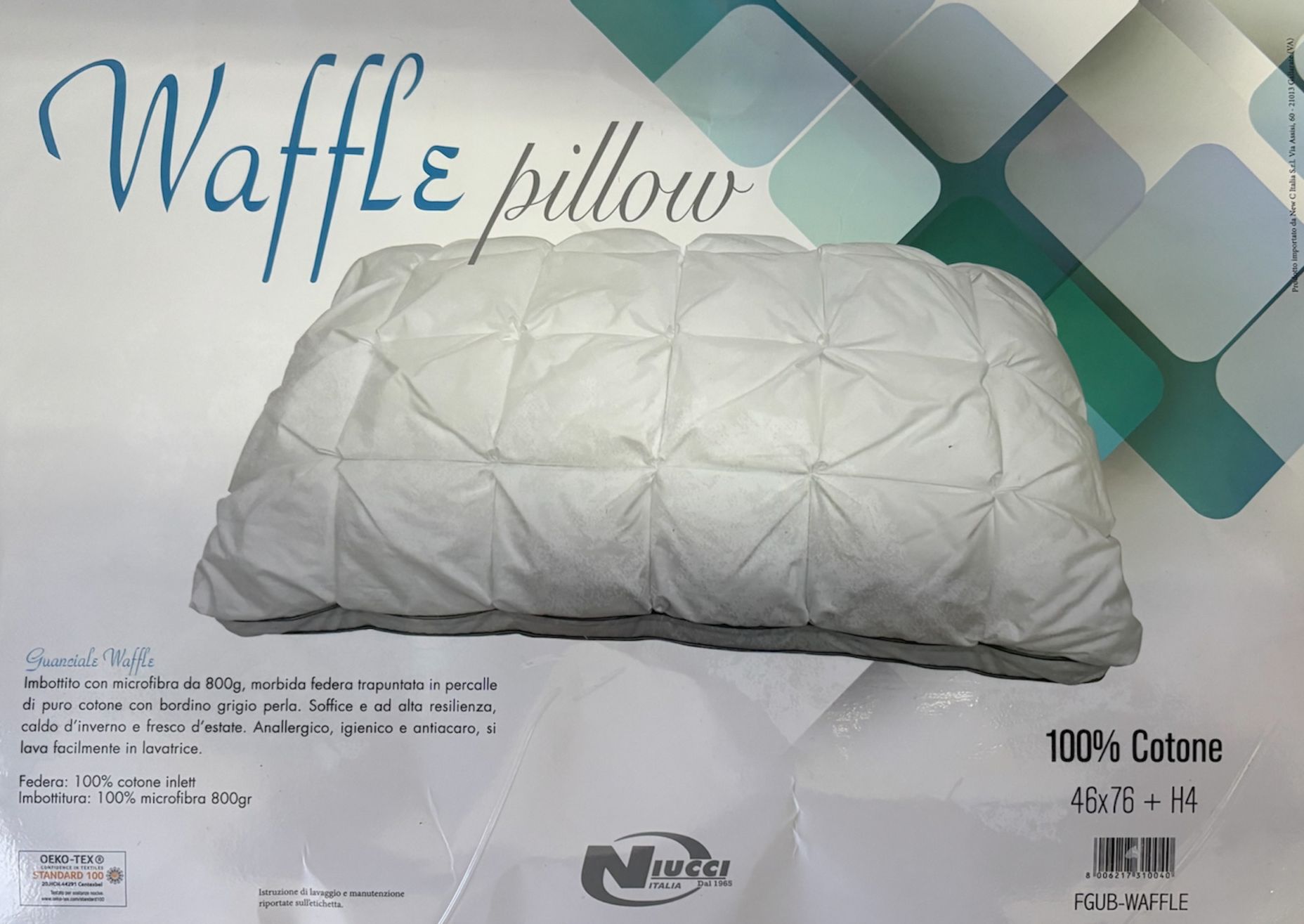 Il guanciale Waffle imbottito con soffice microfibra 800g, morbida federa trapuntata in percalle di puro cotone con lavorazione a quadrotti e con bordino grigio perla. Soffice e ad alta resilienza, caldo d\’inverno e fresco d\’estate. Anallergico, igienico e anti acaro, si lava facilmente in lavatrice.