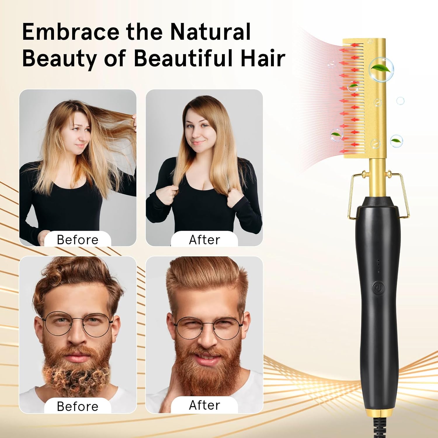 Perfetta per creare acconciature eleganti o un look liscio naturale. Anche gli uomini possono usarla per modellare e curare la barba con facilità. Ottima per ogni occasione: feste, appuntamenti, lavoro o uso quotidiano.