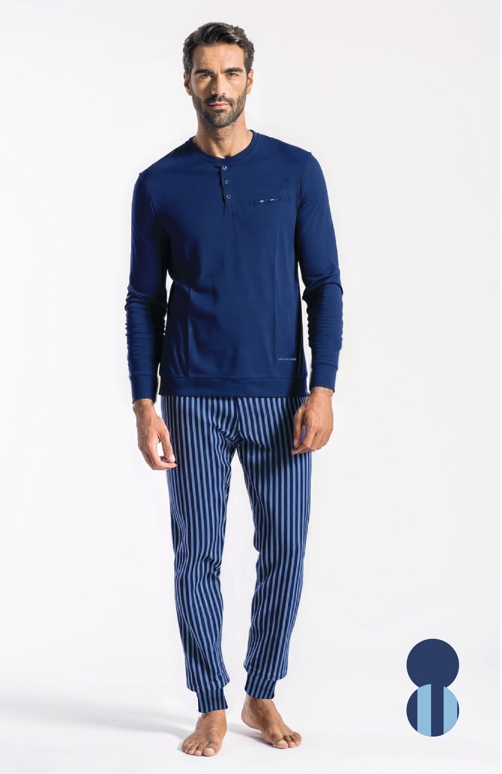 Pigiama uomo Milk and Honey dallo stile moderno e confortevole, perfetto per il relax quotidiano. Il completo è composto da maglia a manica lunga con girocollo e pratica abbottonatura, abbinata a pantalone lungo con fantasia a righe, per un look curato anche nei momenti di riposo.