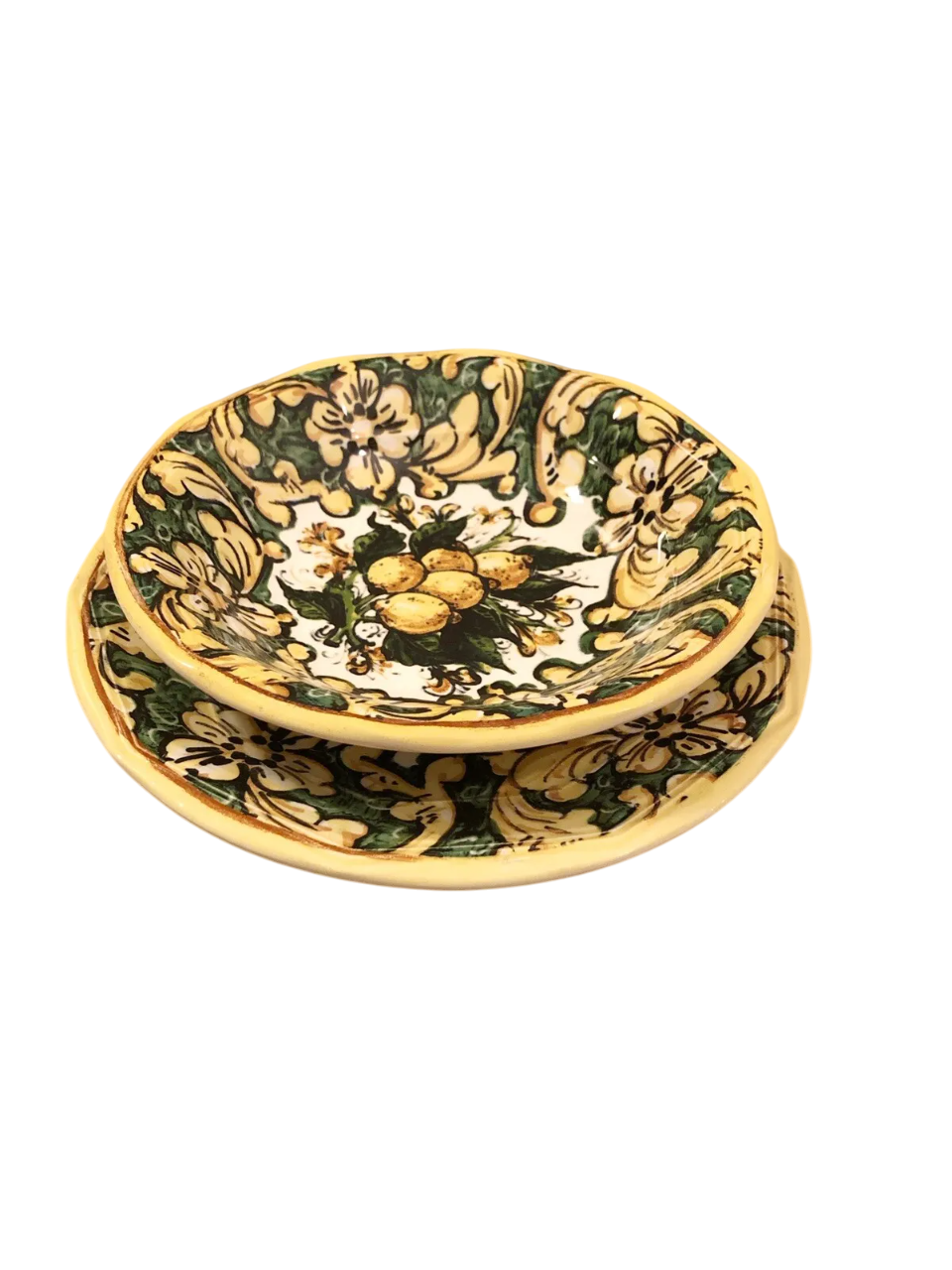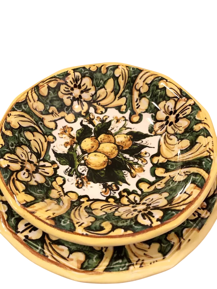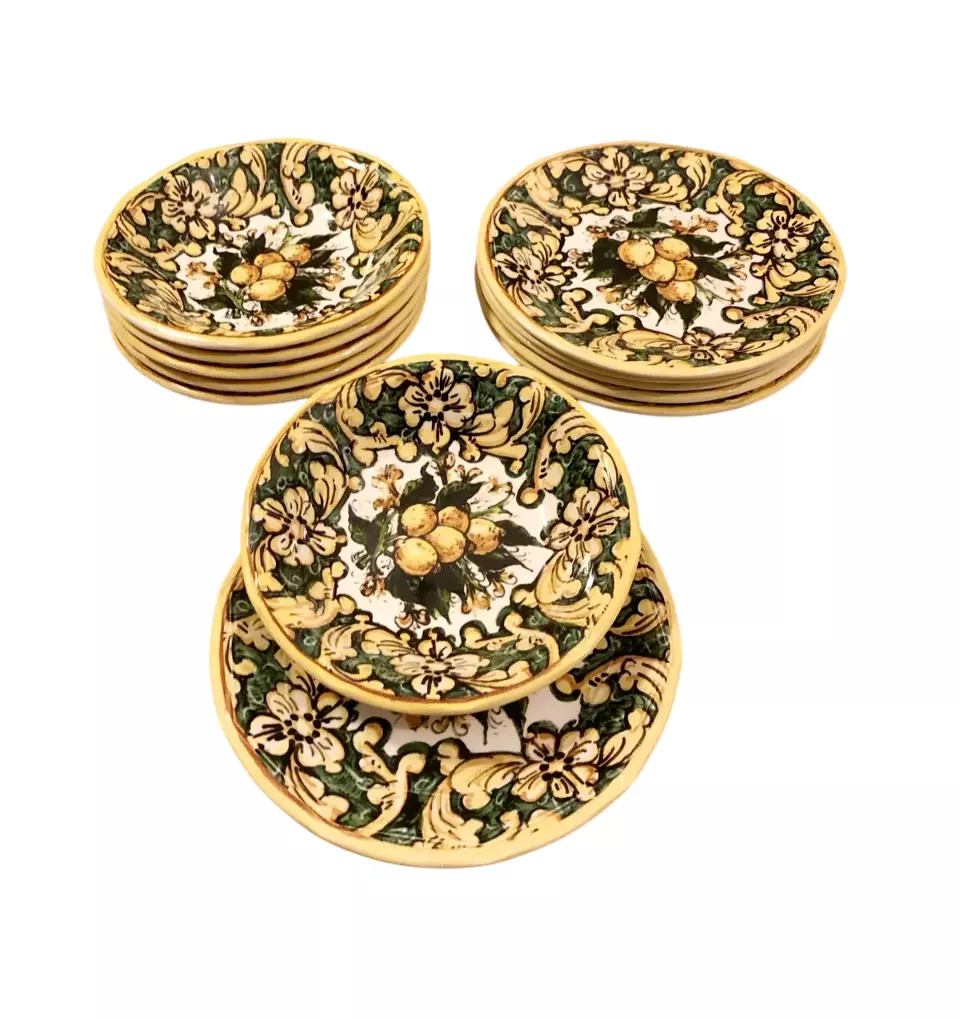 Questo set in ceramica è composto da 6 piatti piani e 4 piatti fondi, tutti decorati con una vivace fantasia di limoni che richiama lo stile mediterraneo. I piatti piani, ideali per servire portate principali, e i piatti fondi, perfetti per zuppe e paste, sono impreziositi da un design raffinato che combina limoni giallo brillante, foglie verde intenso e dettagli floreali su uno sfondo bianco luminoso. Realizzati in ceramica di alta qualità, garantiscono resistenza e durata nel tempo, senza rinunciare all\’eleganza. Questo set versatile e decorativo è perfetto per aggiungere freschezza e colore alla tua tavola, rendendo ogni pasto un momento speciale.