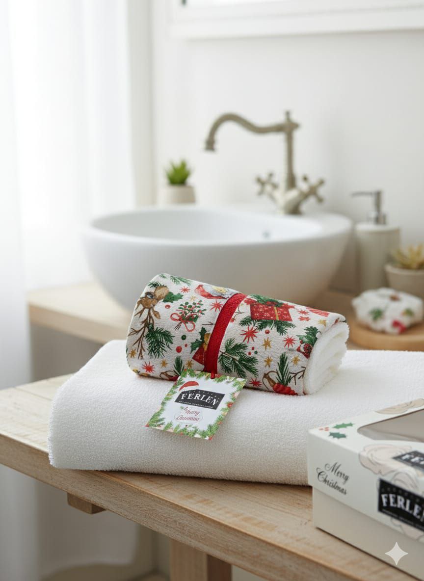 Set Asciugamani Bagno Natale Ferlen “Noel” 1+1 Viso Ospite Spugna 100% Cotone