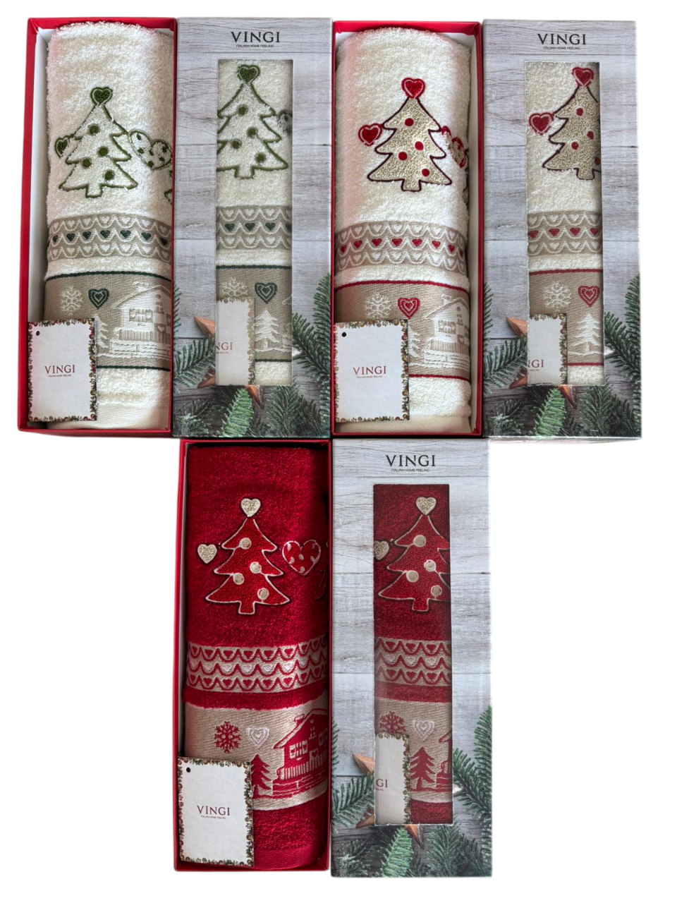 Un set di asciugamani natalizi dell\’azienda Vingi, realizzato in 100% cotone, comprende due pezzi: uno asciugamano per il viso e uno ospite. Il design è pensato per evocare l\’atmosfera festiva del Natale, spesso arricchito da motivi tradizionali come fiocchi di neve, renne, alberi di Natale o colori tipici come rosso, verde e bianco. Il tessuto in cotone garantisce morbidezza, resistenza e un\’elevata capacità di assorbimento, ideale per un uso quotidiano o come decorazione stagionale.