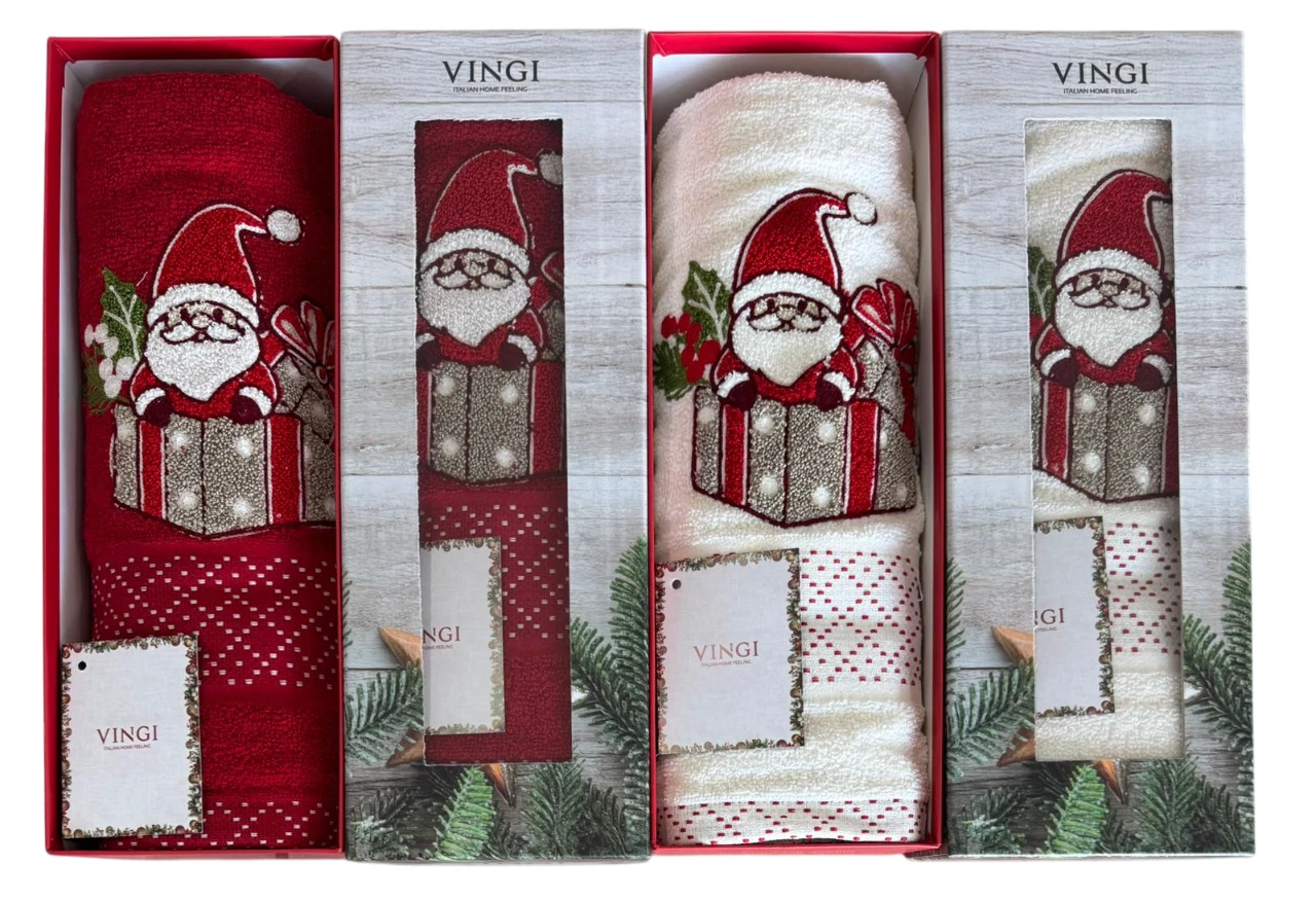 Un set di asciugamani natalizi dell\’azienda Vingi, realizzato in 100% cotone, comprende due pezzi: uno asciugamano per il viso e uno ospite. Il design è pensato per evocare l\’atmosfera festiva del Natale, spesso arricchito da motivi tradizionali come fiocchi di neve, renne, alberi di Natale o colori tipici come rosso, verde e bianco. Il tessuto in cotone garantisce morbidezza, resistenza e un\’elevata capacità di assorbimento, ideale per un uso quotidiano o come decorazione stagionale.