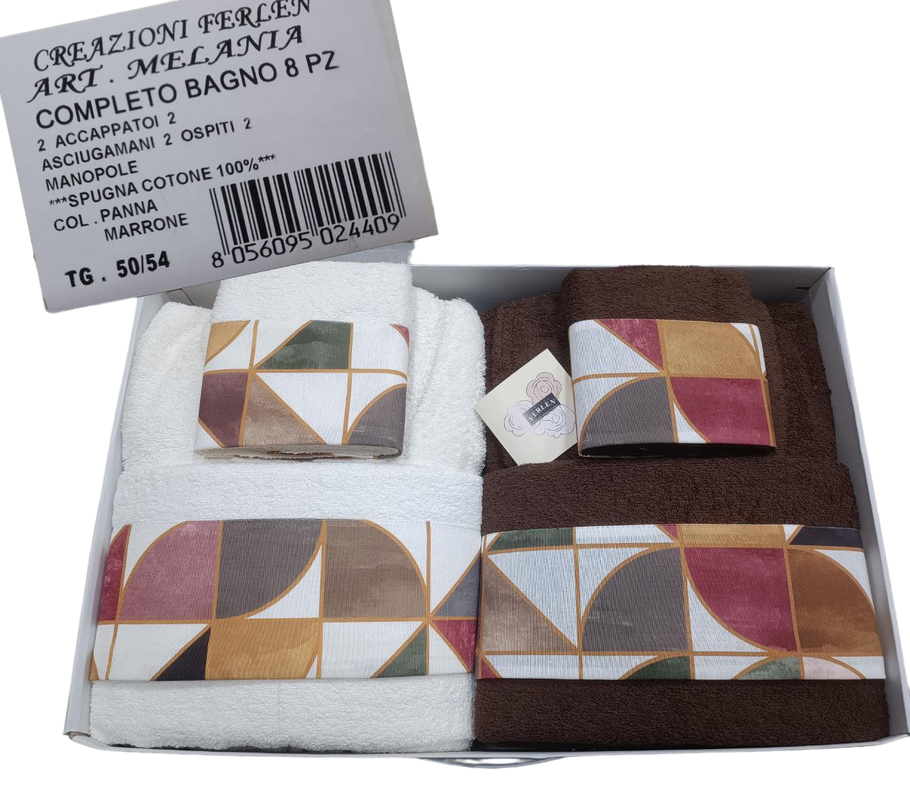 Regalati l\’eleganza quotidiana con il completo bagno Melania, una collezione di 8 pezzi che abbina funzionalità e design raffinato. Ogni accappatoio e asciugamano è finemente realizzato in spugna di cotone di alta qualità, assicurandoti un\’assorbenza eccezionale e un comfort senza pari. La balza jacquard aggiunge un tocco di lusso discreto, rendendo questo set un vero e proprio gioiello per il tuo bagno.