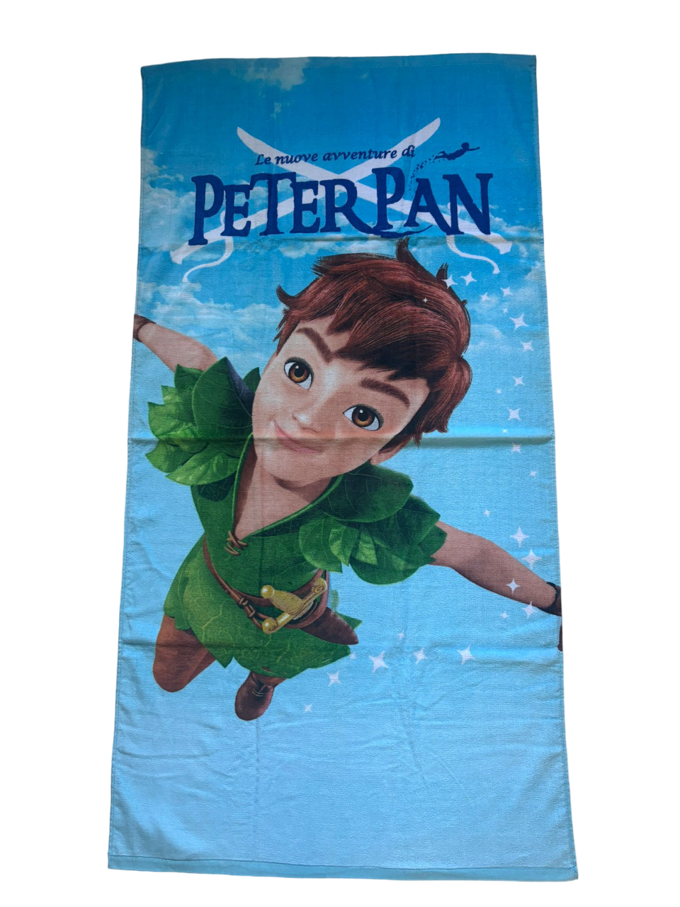 Il telo mare Peter Pan è realizzato in morbida spugna. Si mette in borsa occupando poco spazio e si può portare ovunque. Si asciuga in un attimo.