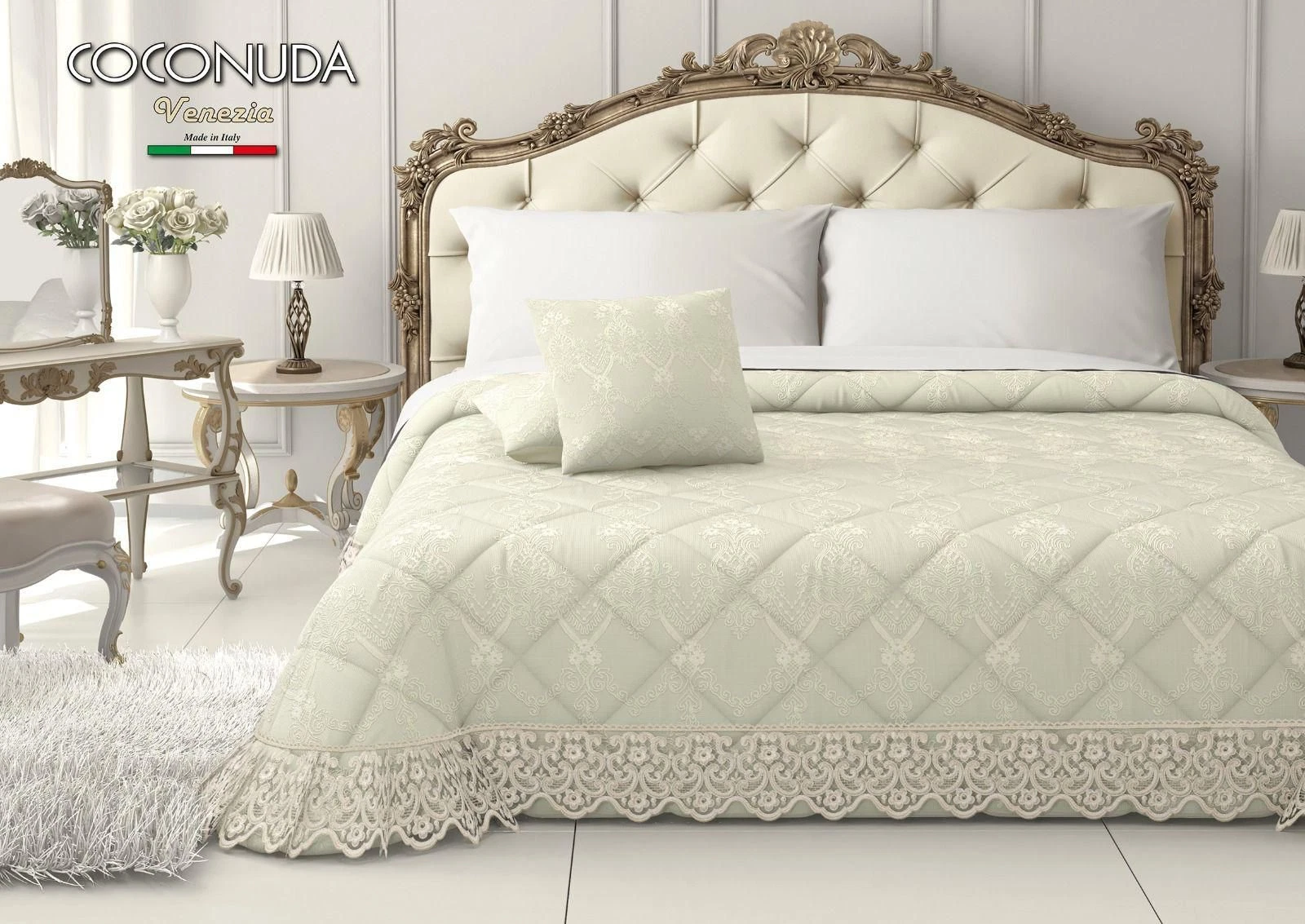 Ricamato con pizzo rebrodè + compresi 2 cuscini arredo abbinati