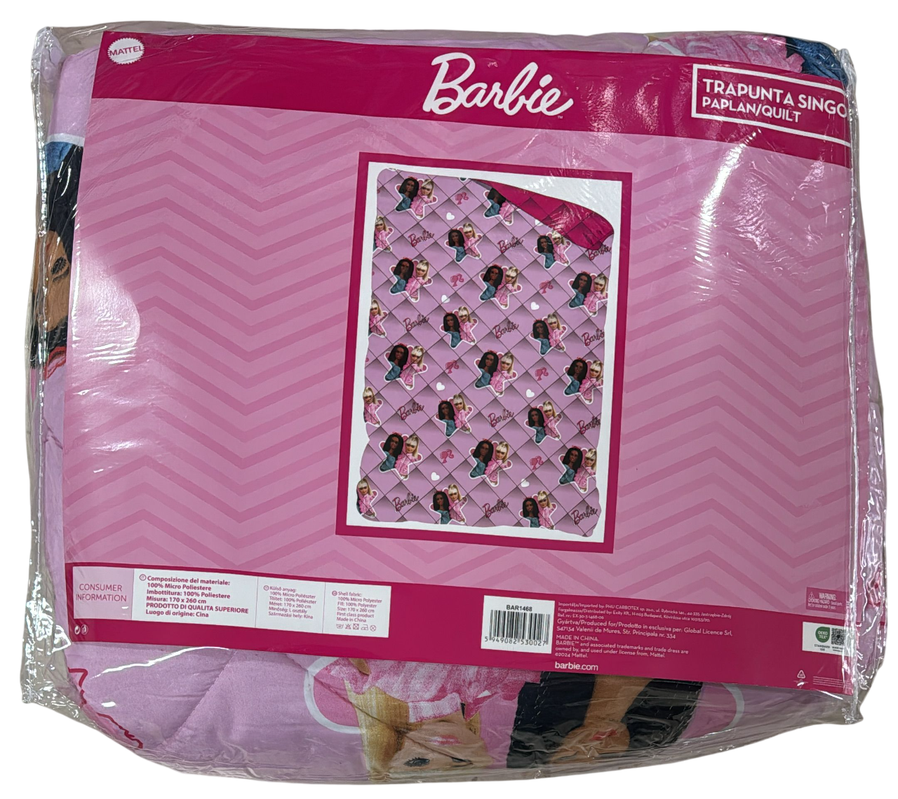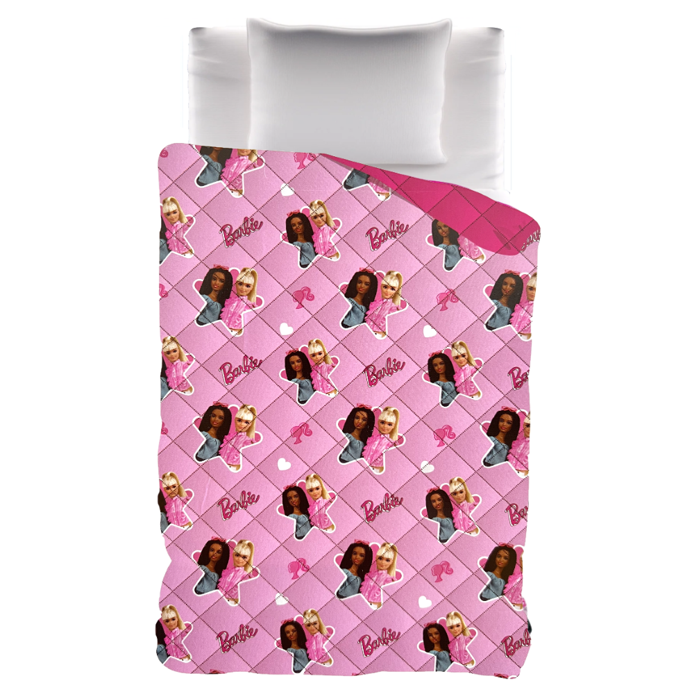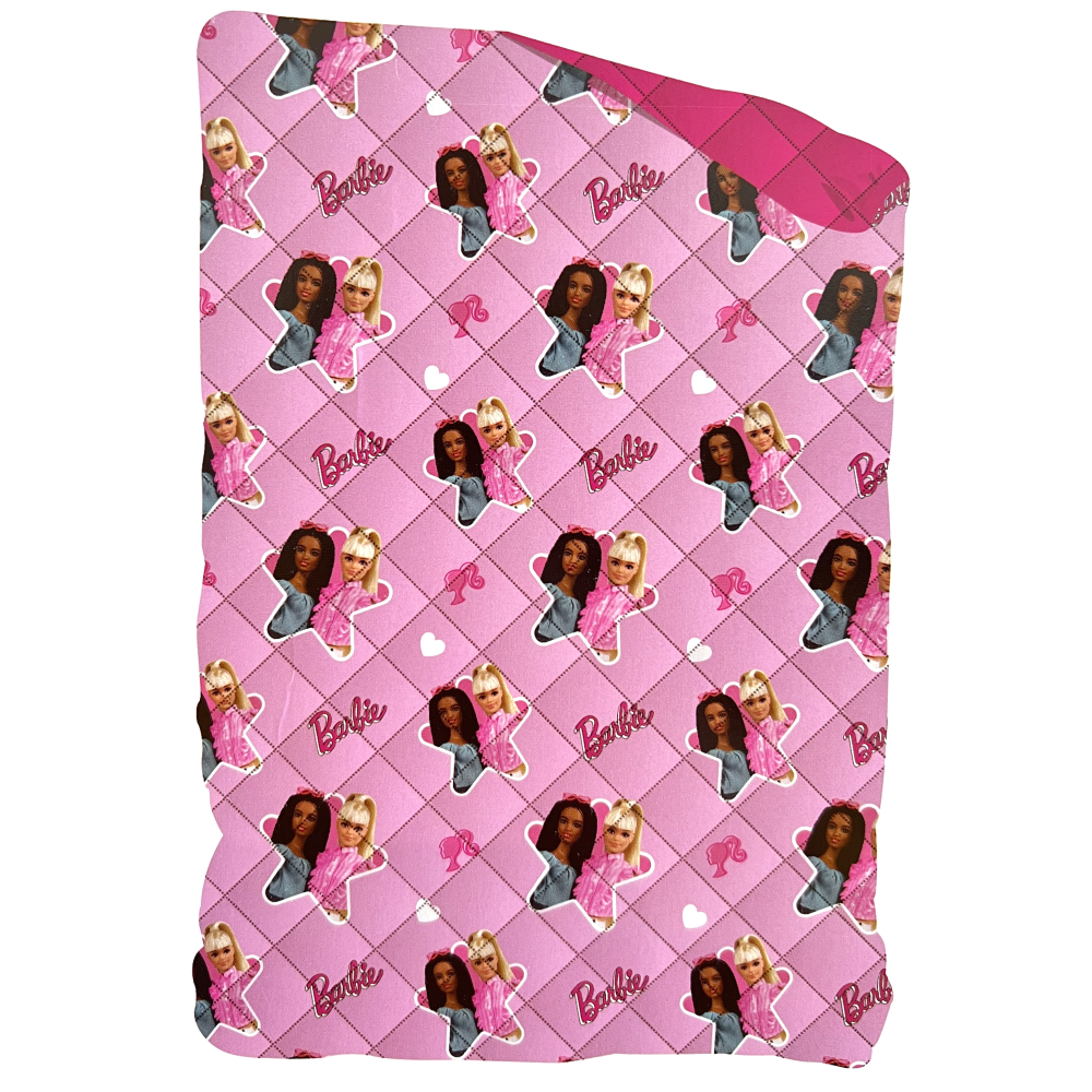 Il design della trapunta è caratterizzato da diverse immagini di Barbie, la celebre bambola, insieme ai suoi simboli distintivi della serie. Questo crea un\’atmosfera divertente e vivace nella camera da letto, perfetta per chi ama Barbie e il suo mondo incantato.