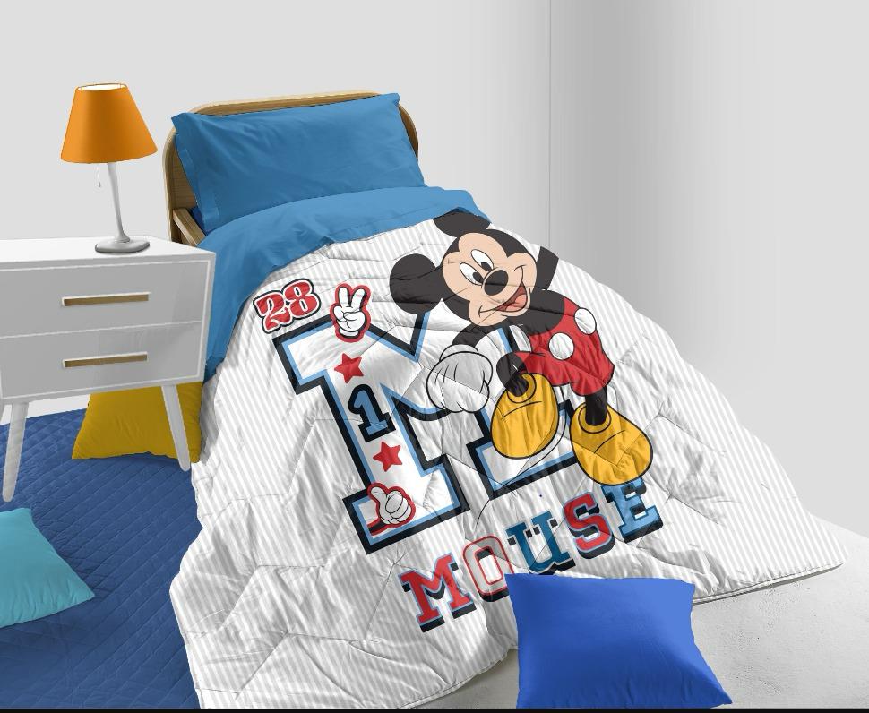 Il colore predominante del copriletto è il bianco, che fornisce uno sfondo vivace e allegro per le immagini di Topolino stampate sulla superficie della trapunta. Le immagini del personaggio sono dettagliate e vibranti, aggiungendo un tocco di gioia e divertimento alla camera da letto dei bambini.