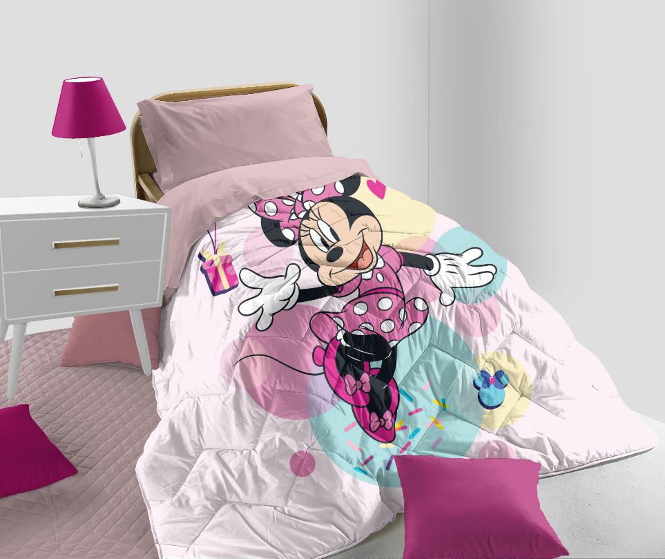 Il colore predominante della trapunta è il rosa, che si intona perfettamente con il tema di Minnie. Sulla superficie della trapunta sono stampate vivaci immagini della simpatica topolina, aggiungendo un tocco di allegria e dolcezza alla camera da letto dei bambini.