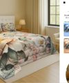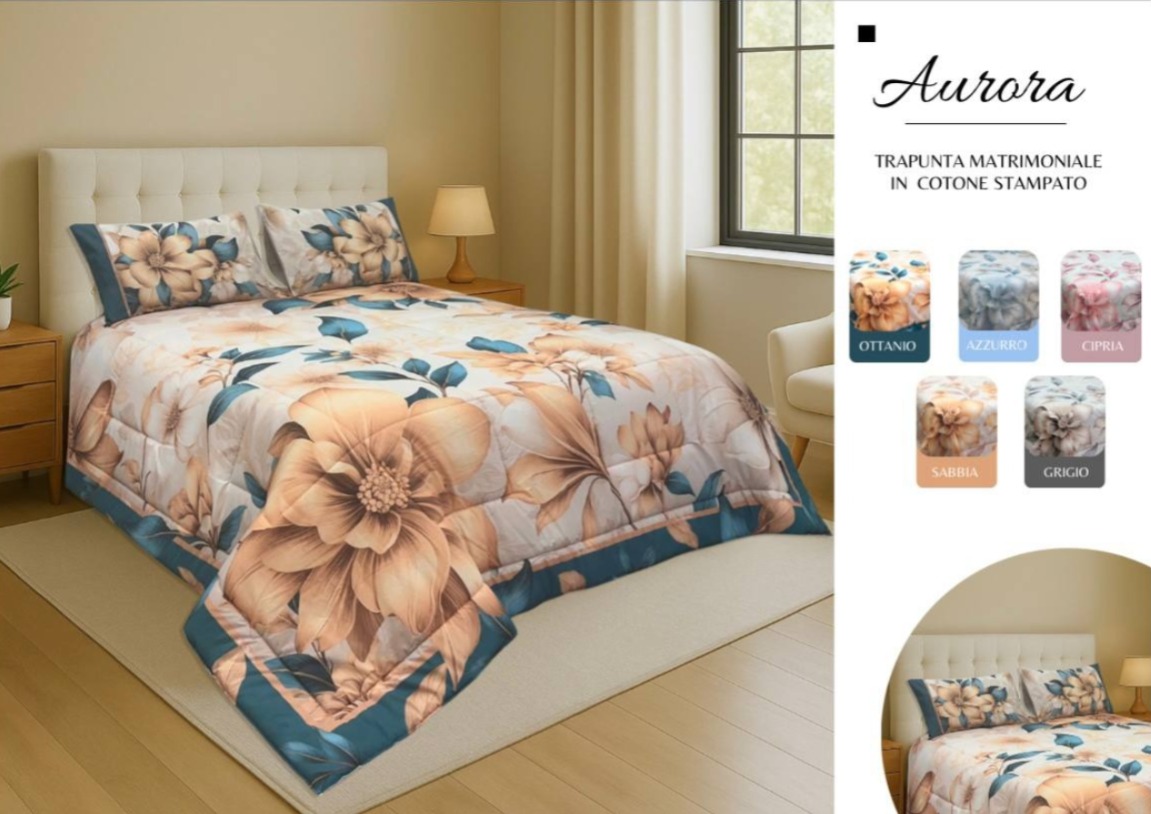 La trapunta Aurora firmata Renato Balestra con la sua stampa crea un effetto vivace ed elegante adatto ad ogni tipo di ambiente.