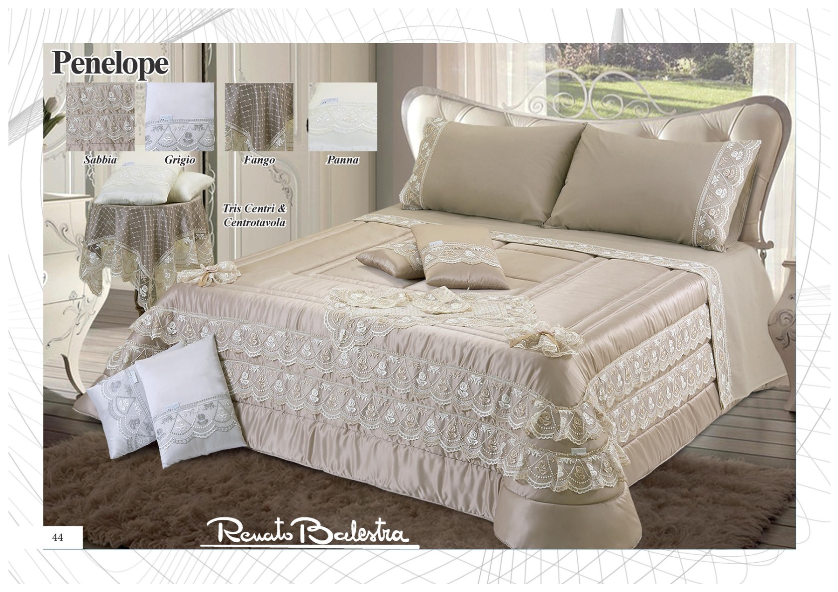 La trapunta Penelope firmata Renato Balestra rappresenta il perfetto connubio fra sobrietà e personalità. Il design fa sì che questo capo non passi inosservato, mantenendo però un aspetto elegante e raffinato, riprodotto anche sui cuscini in coordinato.