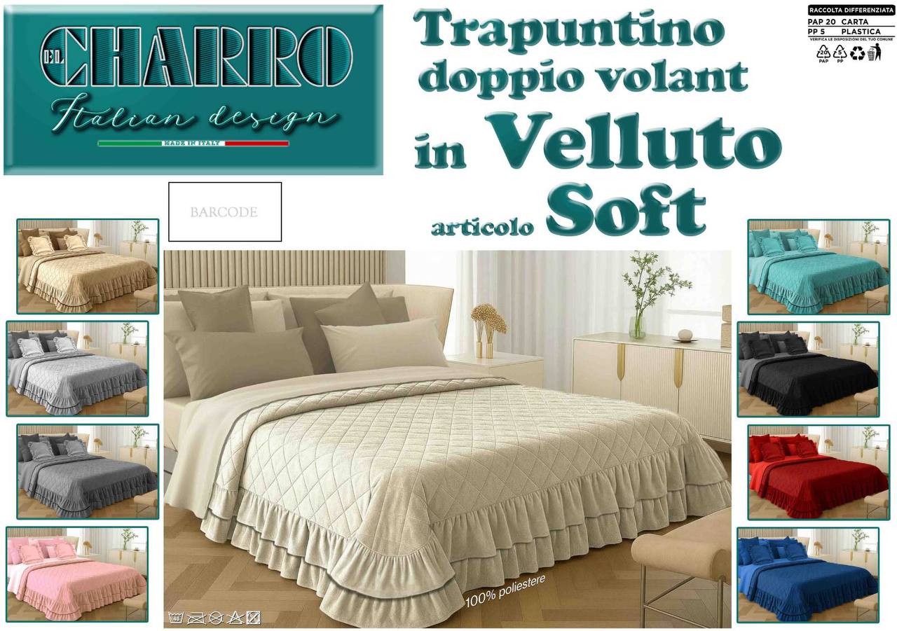 Dona alla tua camera da letto uno stile raffinato e avvolgente con il Trapuntino Matrimoniale Charro Soft in Velluto, caratterizzato da una morbida texture effetto velluto e da un elegante doppio volant che crea movimento e armonia.