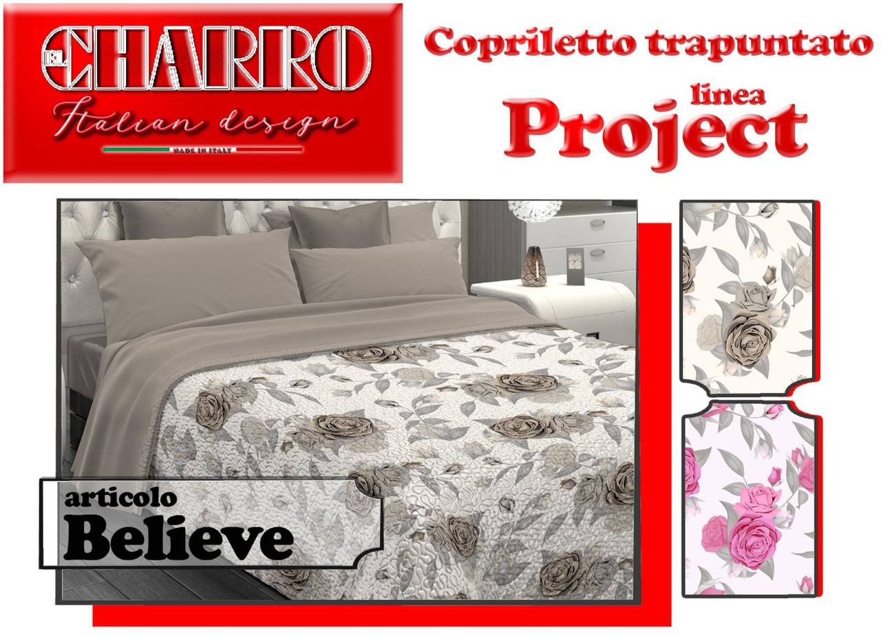 Eleganza e raffinatezza si incontrano nel trapuntino Believe della linea Charro. Un copriletto trapuntato dal design romantico e moderno, impreziosito da una delicata fantasia floreale con rose dai toni neutri e sofisticati, perfetta per donare alla camera da letto un’atmosfera accogliente e armoniosa.