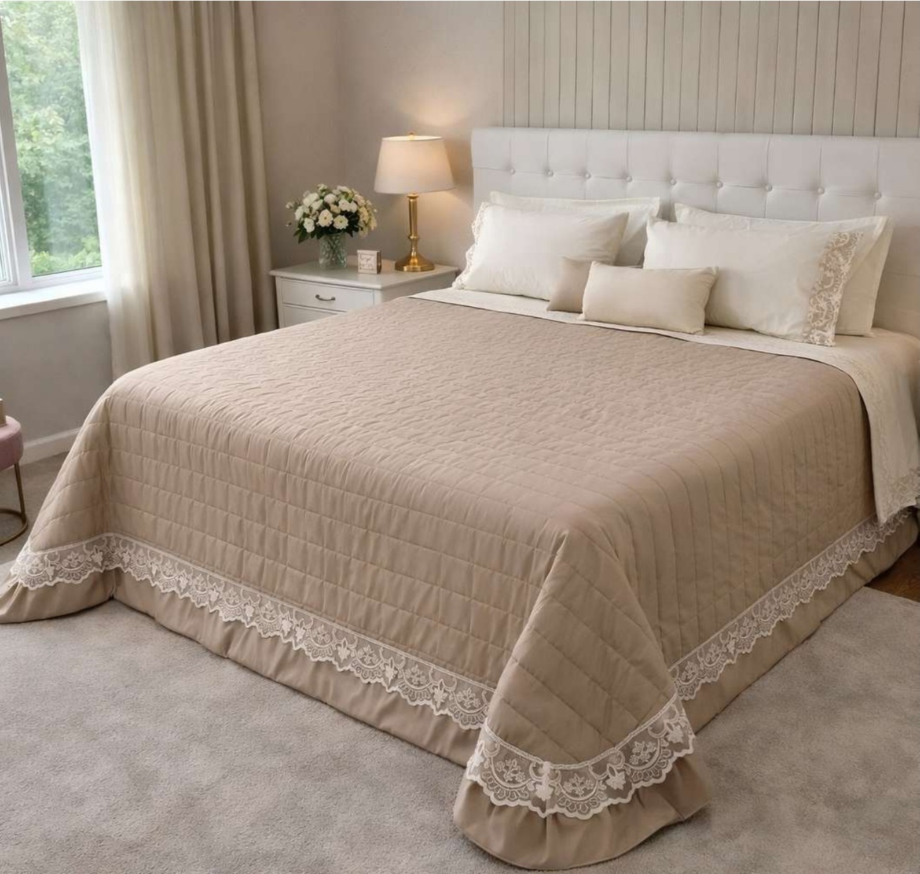 Trapuntino dal gusto romantico e raffinato, proposto in calde tonalità che avvolgono l’ambiente con eleganza e armonia. La superficie delicatamente trapuntata è impreziosita da un bordo con raffinato inserto in pizzo rebrodè, che dona un tocco femminile e ricercato. Morbido e leggero, è ideale per la mezza stagione e perfetto per creare un’atmosfera accogliente e sofisticata in camera da letto.