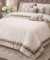 Il set è completo di un raffinato centrone coordinato, impreziosito da applicazioni decorative che richiamano le finiture del trapuntino, per un letto curato in ogni dettaglio. Morbido e avvolgente, è perfetto per vestire il letto con classe, creando un’atmosfera sofisticata e accogliente.