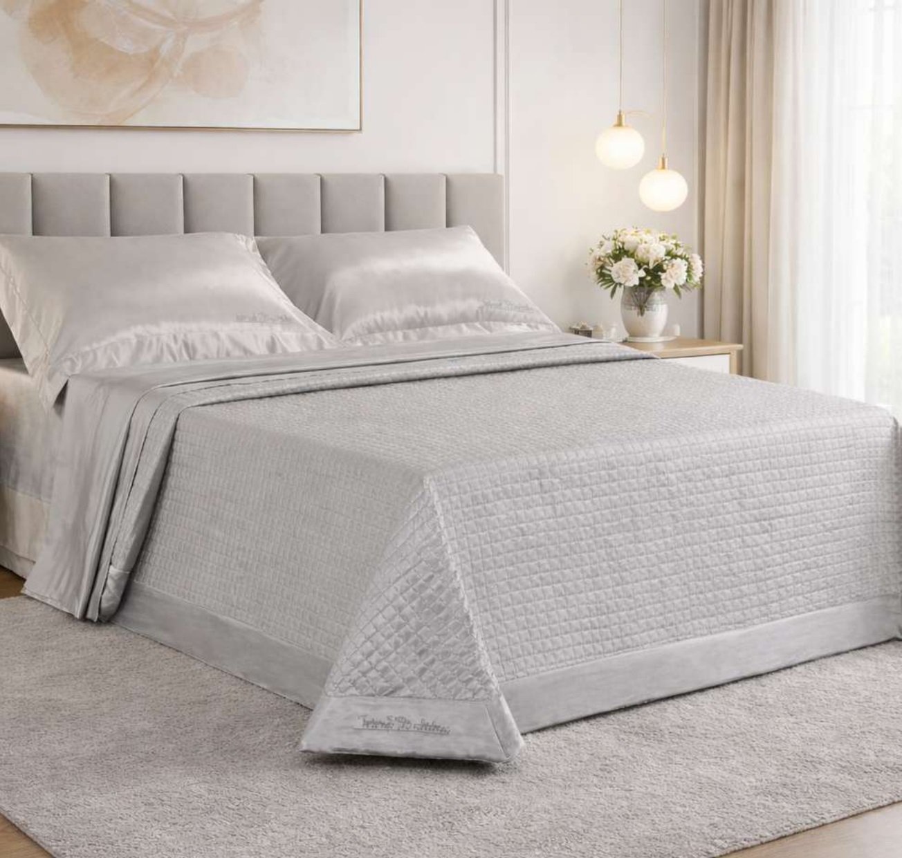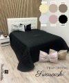 Trapuntino elegante e raffinato dal design minimal, realizzato in morbido raso dalle tonalità neutre e luminose. Trapuntatura a quadratini, rifinita con bordo perimetrale con angolo squadrato e applicazione strass. Avvolge il letto con leggerezza e comfort, aggiungendo un tocco di classe alla camera da letto.