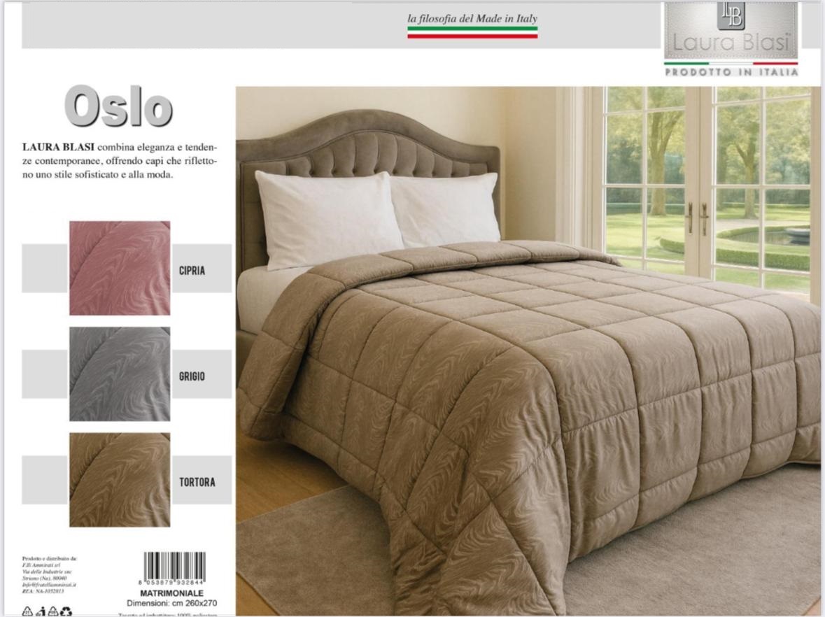 Elegante e raffinato, il trapuntino matrimoniale Laura Blasi modello “Oslo” è realizzato in morbido velluto di alta qualità, impreziosito da un sofisticato motivo decorativo che dona profondità, luminosità e prestigio alla camera da letto.