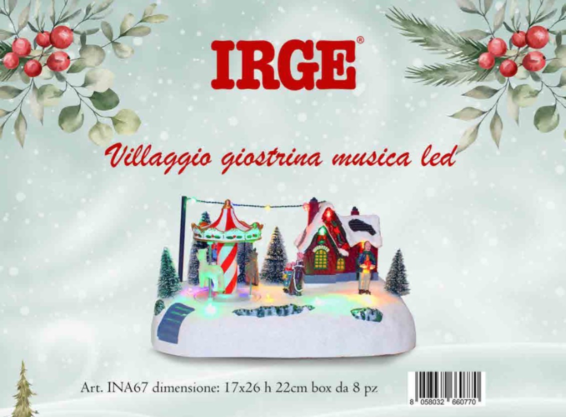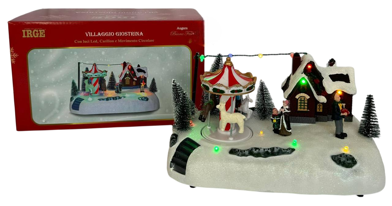 Il Villaggio Natalizio IRGE è un\’incantevole decorazione che porta tutta la magia del Natale nella tua casa. Dotato di una giostrina rotante, una casetta illuminata e personaggi invernali, questo villaggio crea un\’atmosfera festiva unica grazie al movimento animato, ai LED colorati e alla musica natalizia integrata.