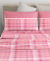 Un elegante sacchetto rosso, decorato con fiocchi di neve, pigne e bacche, racchiude una scenetta invernale con Babbo Natale e pupazzo di neve immersi in una sfera ad acqua glitterata.